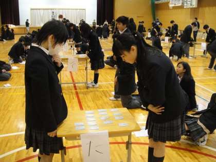 教員が、交代でカルタを読み上げると、歓声やら悲鳴やらが体育館いっぱいに響いていました。上の句ですぐに反応して札を取る生徒、下の句の最後まで聞いて探す生徒と、さまざまでした。冬休みの課題や授業での取組の成果を発揮していました。