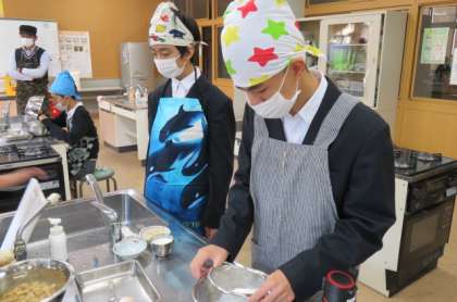 屋上の農園で栽培したサツマイモを使って、朝から1組の調理実習が行われています。