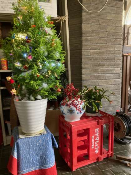 玄関には、少年補導主催のクリスマス会の際に、挿し木で苗から育てたゴールドクレストに、オーナメントを飾り付けてもらいました。