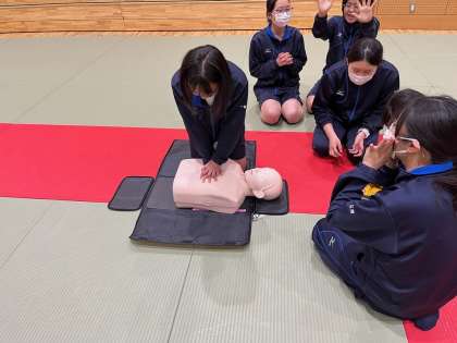 本日の保健体育は救急救命の実技講習でした。病気や事故などで心停止になった人を救うには、救急車が到着するまでの間に、そばに居合わせた人が速やかに心肺蘇生などの応急手当を行う必要があります。いざというときのために、応急手当の知識と技術を身につけておきましょう。