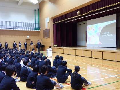 令和6年度 志の式の様子です。校長先生の話では、節目と自分らしさの話がありました。竹の成長が驚異的なのは、節目それぞれが伸びるからで、「節目」は人にとっても大切という話です。そして、校是「志 きらめく」の下、気持ち新たに「自分らしい生き方を見つけるために学び続けてください」と話されました。生徒たちの真剣に聞く姿から、今年度にかける意気込みが感じられました。