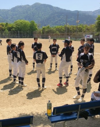 5月3日(祝)には、岡崎グランドで下鴨中学校と対戦。1回に2点を取り、この日もさい先のよいスタート。5回に同点に追いつかれましたが、6・7回と得点を重ね、5−2で勝ち上がりました。