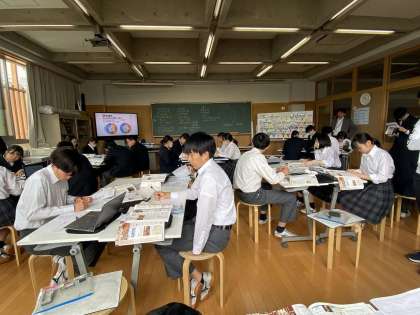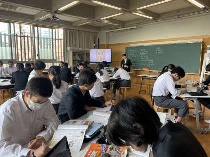 現代とは異なる部分(選挙制度等)を比較し、資料を丁寧に読み解いていきます。必ず自分の頭で考え、時々、意見を交流します。欧米の技術・文化を積極的に取り入れた時代ということで、話は日本にとどまらず、イギリス・フランス・ドイツ等の国名も登場していました。