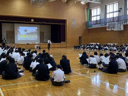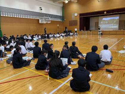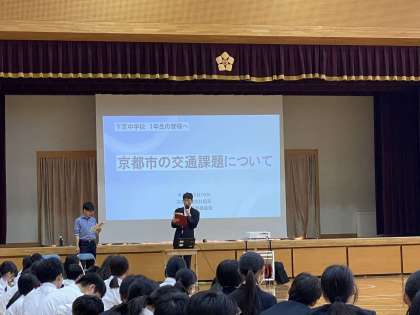 5月16日(木)、1年生総合の時間に、ゲストティーチャーによる講演会を実施しました。「地域に生きる私〜人権・伝統文化の視点より〜」をテーマとする探究学習の一環で、京都市役所「歩くまち京都推進室」より講師お二人にお越しいただきました。講演タイトルは「京都市の交通課題について」。