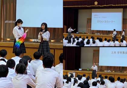 そのあと、実行委員会から「千羽鶴の紹介」「修学旅行スローガン」「服装等の注意事項」があり、松葉先生と中村先生から、共に作り上げてきた修学旅行の成功に向けて、話がありました。