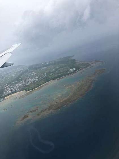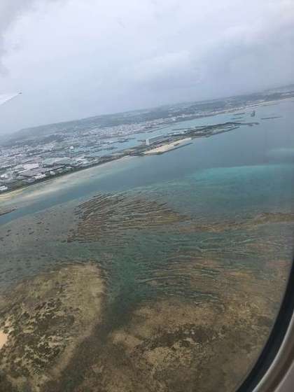初めての飛行機で離着陸は声が上がったりしていました。那覇空港に無事到着です(13時ごろ)。