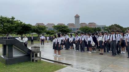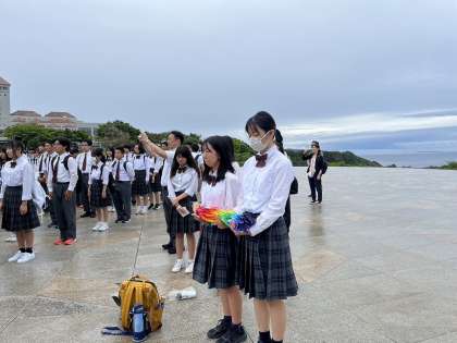 平和セレモニーの様子です。みんなで制作した千羽鶴を奉納しました。雨の上がった公園で、平和への思いを強くしました。