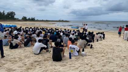 午後のビーチレクが始まりました。天候は曇り。午前中に体力を使って疲れていますが、元気にがんばっていきます。レクレーション実行委員主催です。