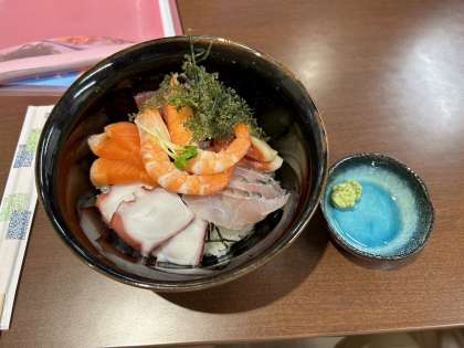 班別研修がスタートしています。アクティブに行動し、沖縄の魅力を、めいっぱい感じてください。食文化も含めて。(写真中:牧志公設市場の海鮮丼)(写真下:サーターアンダギーの店)