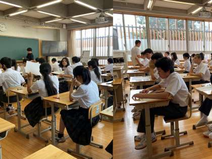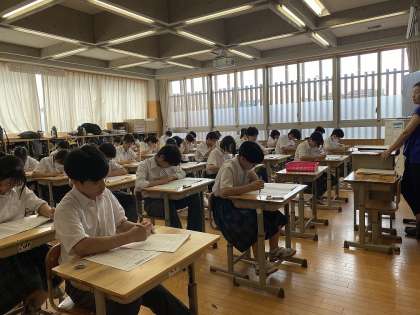 2年生は、7月2日〜3日の2日間、学習確認プログラム「Pre Stage 1」に取り組んでいます。学習してきたことがどこまで定着しているかを確認するためのテストです。雨も上がり、むし暑くなりそうな一日ですが、朝から真剣に問題に取り組んでいます。