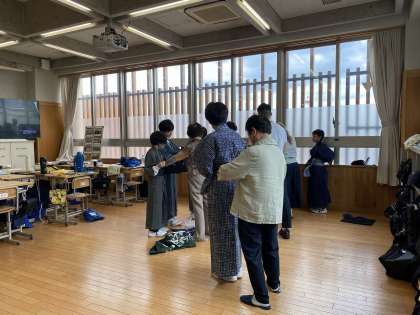 時間をかけて、一つ一つ教わりながら、浴衣を着ています。早く着られた生徒は、今度は出来るだけ一人で着ることを目標に、再挑戦しました。