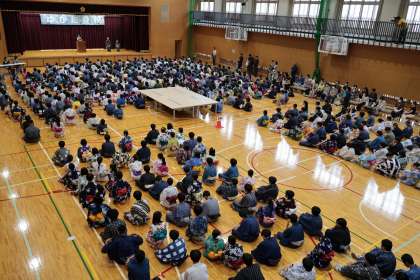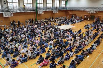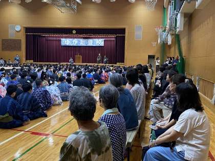 全員のゆかたの着付けが終わり、体育館で全校集会を行いました。朝から駆けつけてくださった地域女性会の皆様やPTAの皆様にも同席いただきました。来賓の方々から、お言葉をいただき、ゆかたの魅力をまた一つ学びました。