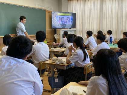2年生は「外国人に関わる人権」をテーマに学習しました。日本で生活する外国人が増加する中「異なる文化を持つ人たちと友好な関係を築くためにどうすればよいか」という問いについて考えました。