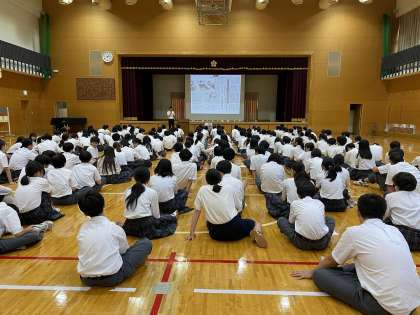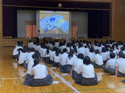教室での学習のあと、京都朝鮮中高級学校で教鞭をとっておられる朴欣玟(ぱくふんみん)先生より、ご自身の経験をもとに、人権問題についてお話いただきました。本名を名乗るまでの葛藤(かっとう)、朝鮮中高級学校の日常、下京中との共通点と相違点等の話をされ、「同じ人間としてお互い認め合っていくために、相手を知ることが大事」「誰かの人権を考えることは自分自身の人権を考えること」という言葉で講演は終了しました。