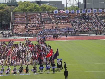 夏を思わせる晴天に恵まれた29日(日)、春体開会式が、西京極総合運動公園で行われました。