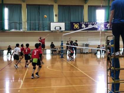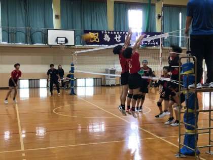 相手のスパイクに対して、果敢にブロックに飛びます。コートが変わって第2セット。得点を取っては、取られるシーソーゲームの展開の中、下京中学校に波が来ます。チャンスをものにして、第2セットを勝利します。