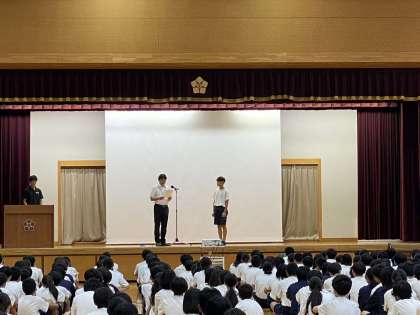 伝達表彰では、吹奏楽部・野球部・柔道部・陸上競技部の表彰と、良い歯の表彰を行いました。