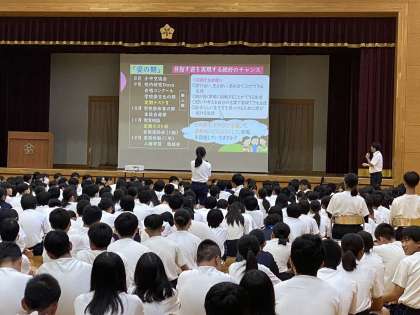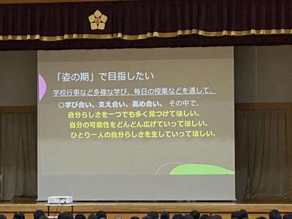 「『(4つの)目指す生徒像』を意識し、自分の伸ばしたい力を伸ばしてほしい。数々の学校行事がある姿の期は、学びのチャンスです。特に『伝統(=古きよきものを受け継ぎながら、新しい手法を取り入れ挑戦していく)』を意識して、さまざまな学校行事を通して、伸ばしたい力を伸ばしていきましょう。」