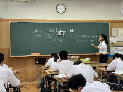 教育実習生の実習期間が最終週に入り、幾つかのクラスで授業を行っています。1年生の英語では、好きな物を尋ねる表現を学習しました。「What(名詞)du you like?」の疑問文で、(名詞)のところに入る単語によって、「どんな果物が好きですか?」「どんなスポーツが好きですか?」等、さまざまな表現が出来ます。
