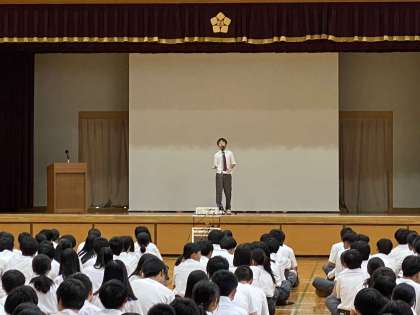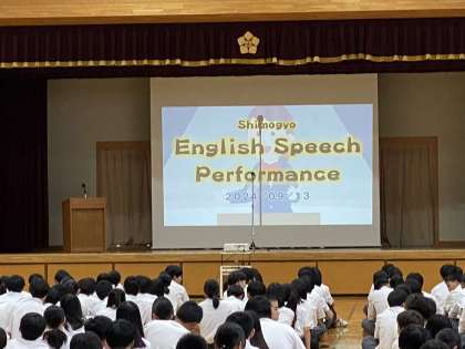 英語パフォーマンスの様子です。1年生は自己紹介、2年生は「食べ物の歴史」「憧れの人紹介」、3年生は、メッセージ性のある作品を選んでスピーチしました。