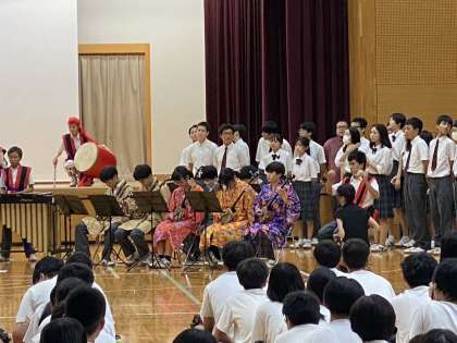 1組と3年有志による器楽演奏は、石垣島の中学生が詩を書いた「島人ぬ宝(しまんちゅぬたから)」です。沖縄の楽器「三線(さんしん)」「大鼓」「締大鼓(しめだいこ)」を使って、演奏しました。