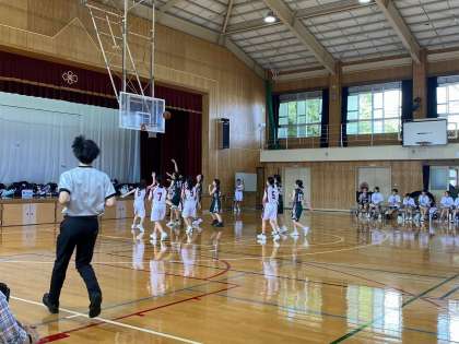 試合開始早々、下京中がシュートを決め、試合の流れをつかみました。攻めの姿勢で、ひるまず自分たちの持ち味をいかしたプレーが続きます。2クォーター終了時、34対10でリード。