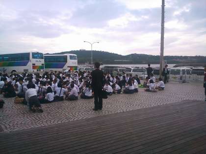 3年生の修学旅行は,順調に進んでいます。予定通り12時過ぎに那覇空港に到着し,その後,南部にある平和祈念資料館を見学しました。14時半には南部を後にして,バスにて北上し,現在,本部港からフェリーに乗船し,伊江島に向かっています。空→陸→海の旅の後,まもなく,伊江島の民家の方との対面式です。少し曇っていますが,楽しい旅が続いているようです。写真は,那覇空港到着後のようすと,本部港でのフェリー乗船前の様子です。