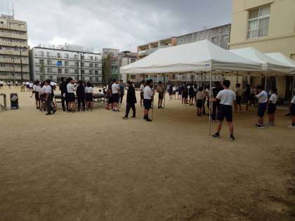 グラウンドの石拾い、ライン引き、テント設営、いす並べ等、協力して行い、15時過ぎに準備が完了しました。