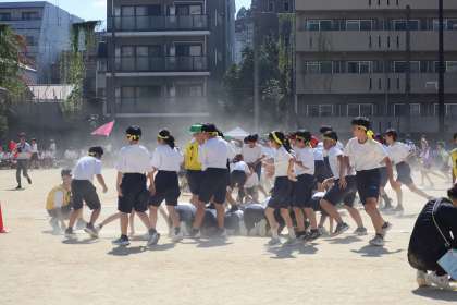 1年生学年種目は「栄光の架け橋」。段ボールを広げた土台に、橋を架けるのはクラスメンバー、その橋の上をランナーが走っていく、というストーリー性のある競技です。どのクラスもチームワーク抜群で取り組みました。