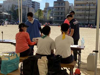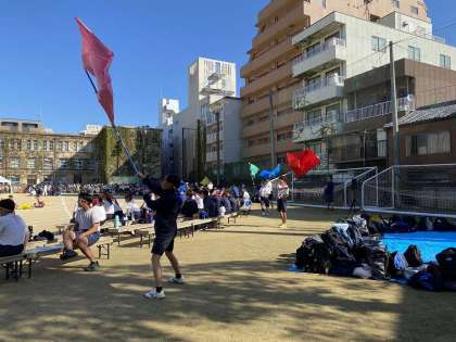 競技だけでなく、係としての役割もしっかり果たしました。応援席からの応援と共に、各色の団旗を持って応援しました。