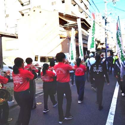 下京中学校から下京警察署までのマーチングでは、「風になりたい」を演奏しました。