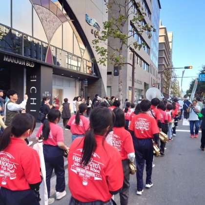 今年は数年ぶりのパレード開催ということで、沿道にたくさんの方々が訪れ、大変盛り上がりました。地域の方々をはじめ、外国人観光客の方々も、立ち止まって演奏を聴いていました。その場の人々が一体となって音楽を楽しむことを、身をもって体感できた一日でした。