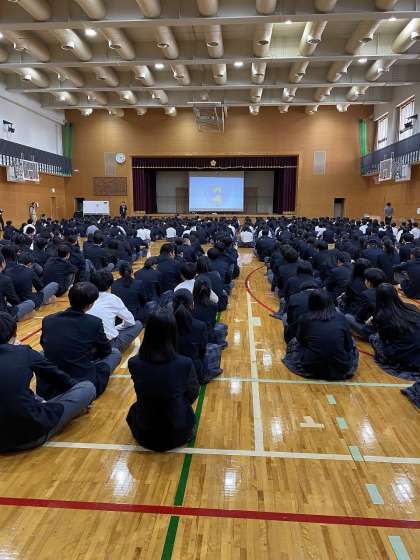 12月は人権月間です。本日12月2日(月)6限、人権学習に関する「校長講話」を行いました。集会の隊形で体育館に集合し、校長先生の授業がスタートしました。