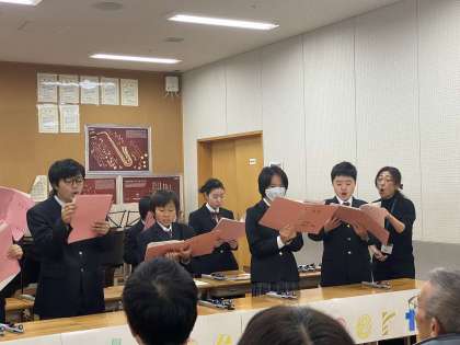 12月17日(火)、クリスマスコンサートを行いました。クリスマスにちなんだ歌や演奏を楽しんでもらおうと、音楽の授業で準備してきました。手作りのプログラムと飾りつけをした音楽室で10時に開演です。