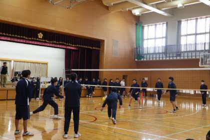 3年生は、卒業を目前に控え、今日から特別時間割です。本日、学年球技大会を実施しました。男女混合バレーボール大会です。2、6、7組(舞台側コート)、3、4、5組(出入口側コート)の2つに分かれ、それぞれ総当たりで対戦した後、順位決定戦を行いました。みんな全力投球、応援も全力投球!終始盛り上がりました。勝ち負けに関係なく、どのクラスも一致団結、楽しく和気あいあいとした雰囲気で、とてもよかったです。