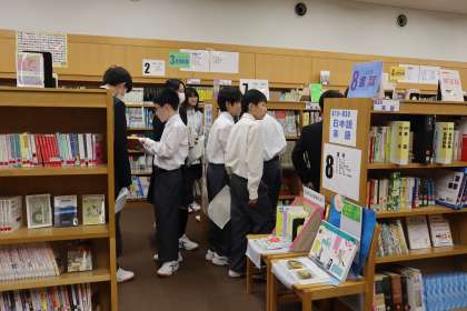 ミッションをクリアするため、書棚に並ぶ本をじっくり見て、思い思いの本を手に取り、ページを開ける生徒たちです。