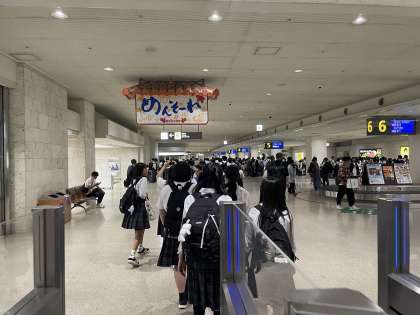 那覇空港内を歩いている様子。「めんそーれ(=いらっしゃい)」