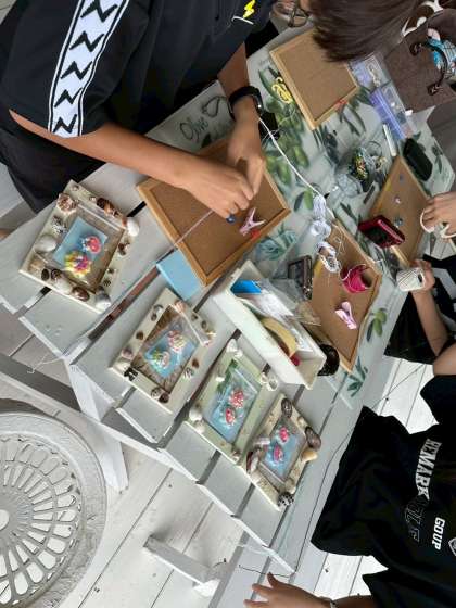 フォトフレーム作りに取り組んでいる様子。夢中になって、一つ一つ丁寧に進めています。(写真上・中)