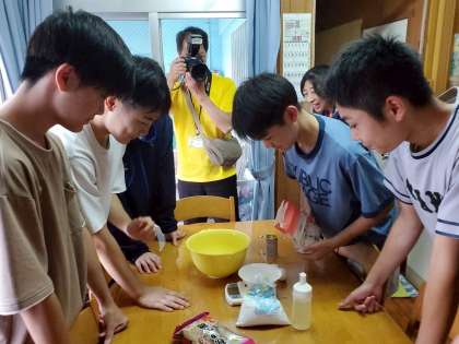 サーターアンダギーを作っている班もあります。材料の分量を計っています。(写真下)