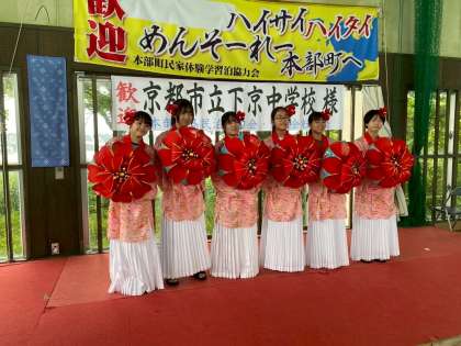 琉球衣装を着させてもらっている班です。髪飾りをつけて、とても似合っていました。(写真上)