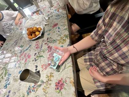 サーターアンダギーとアクセサリー作りに取り組んでいます。出来上がりが楽しみです。(写真中)