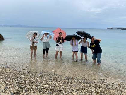 小雨の中、ビーチ散策に出かけた班に出会いました。海の景色と海水を楽しんでいます。(写真下)