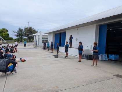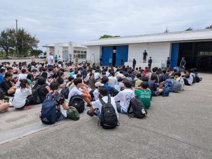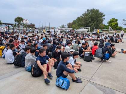もとぶ元気村に到着。午後のマリン体験オリエンテーションが始まりました。奇跡の晴れ間が続いています。気温が高く蒸し暑い、まさに海日和です。