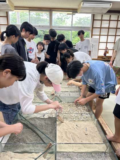 Cコースのジェルキャンドルづくりの様子。グラスに沖縄の砂・サンゴ・貝殻を入れて、透明なロウを流し込み、オリジナルキャンドルを作ります。(写真上)