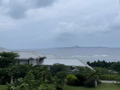 17時35分、ロイヤルビューホテル美ら海に、無事到着しました。荷物を持って、部屋へと移動します。オーシャンビューの部屋からは、沖縄戦の激戦地、伊江島が望めます。