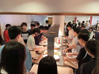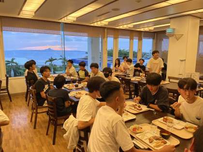 19時、夕日に輝く伊江島をバックに、食事タイムがスタートしました。さまざまな体験活動があった一日、みんなで賑やかに食べる夕食は、さぞかし美味しいことでしょう。