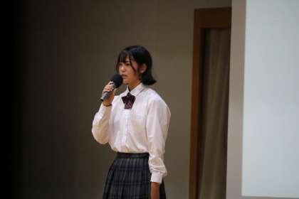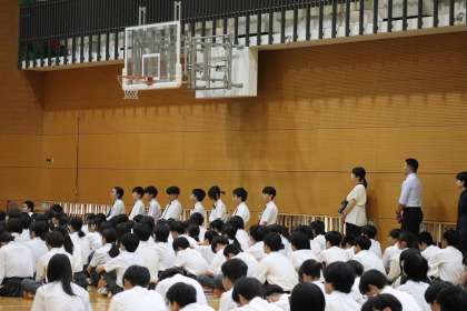 前半では、今年度の生徒会スローガン『絆〜Look for My Colors〜』が発表されました。このスローガンには、学年を超えた交流を大切にし、互いの個性を認め合いながら、自分らしさを発揮していこうという思いが込められています。これは、下京中学校の合言葉「自分らしい生き方」にもつながる、素晴らしいメッセージです。