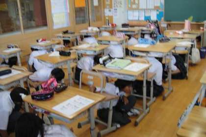 写真は、被災地の話に聞き入る生徒《上》、「地震発生!」の放送に、机の下に隠れ放送に耳を傾ける生徒《中》、避難後に重要な情報を伝え合う訓練をする生徒《下》の様子です。