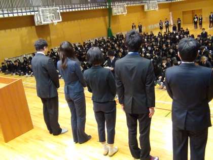 続いて行われた『志の式』では、「今日ここに、391名の仲間が集いました。明日は、198名の新入生を迎える予定です。教職員を合わせると700名近い『いのち』が集います。その周囲には、家族がいます。それらを合わせると、2000を超える『いのち』が、君たちを支えています。もちろん、いつも君たちを見守っている地域の方々の『いのち』もあります。大切な一つ一つの『いのち』を輝かせ、『志きらめく』新しい未来を、ともに創っていきましょう。」と学校長のお話がありました。