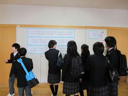 開式に先立ち、9時より新学級の発表を行いました。自分の名前だけでなく、友だちの名を見つけ、喜んで走り回る生徒もいました。